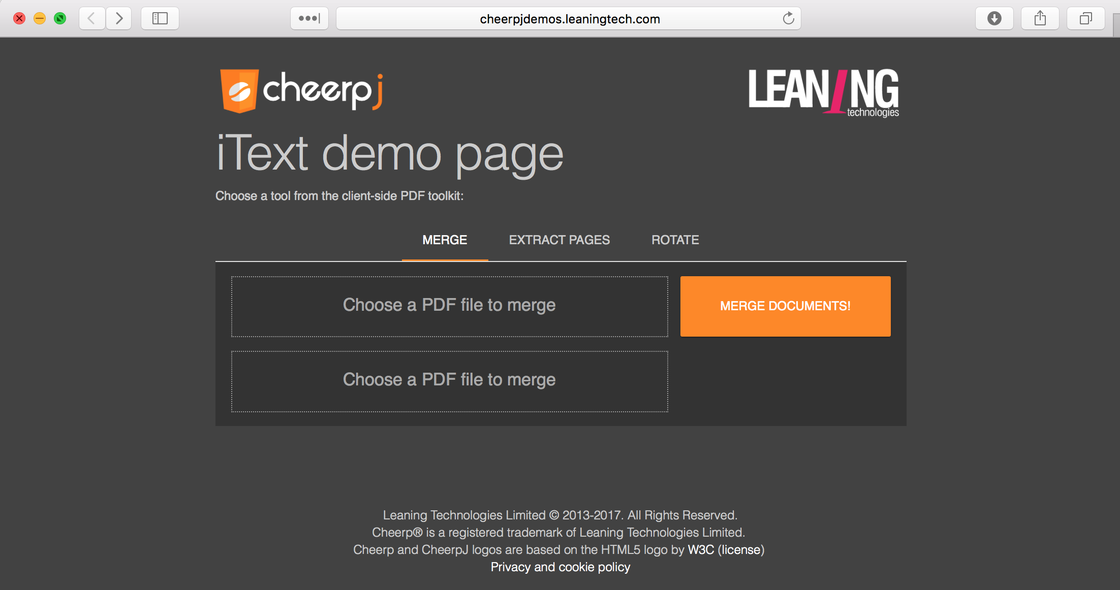 Edit PDFs fully client side using the industry standard iText library converted to JavaScript. This demo demonstrates how CheerpJ APIs can be used to instance Java objects and call methods directly from JavaScript.