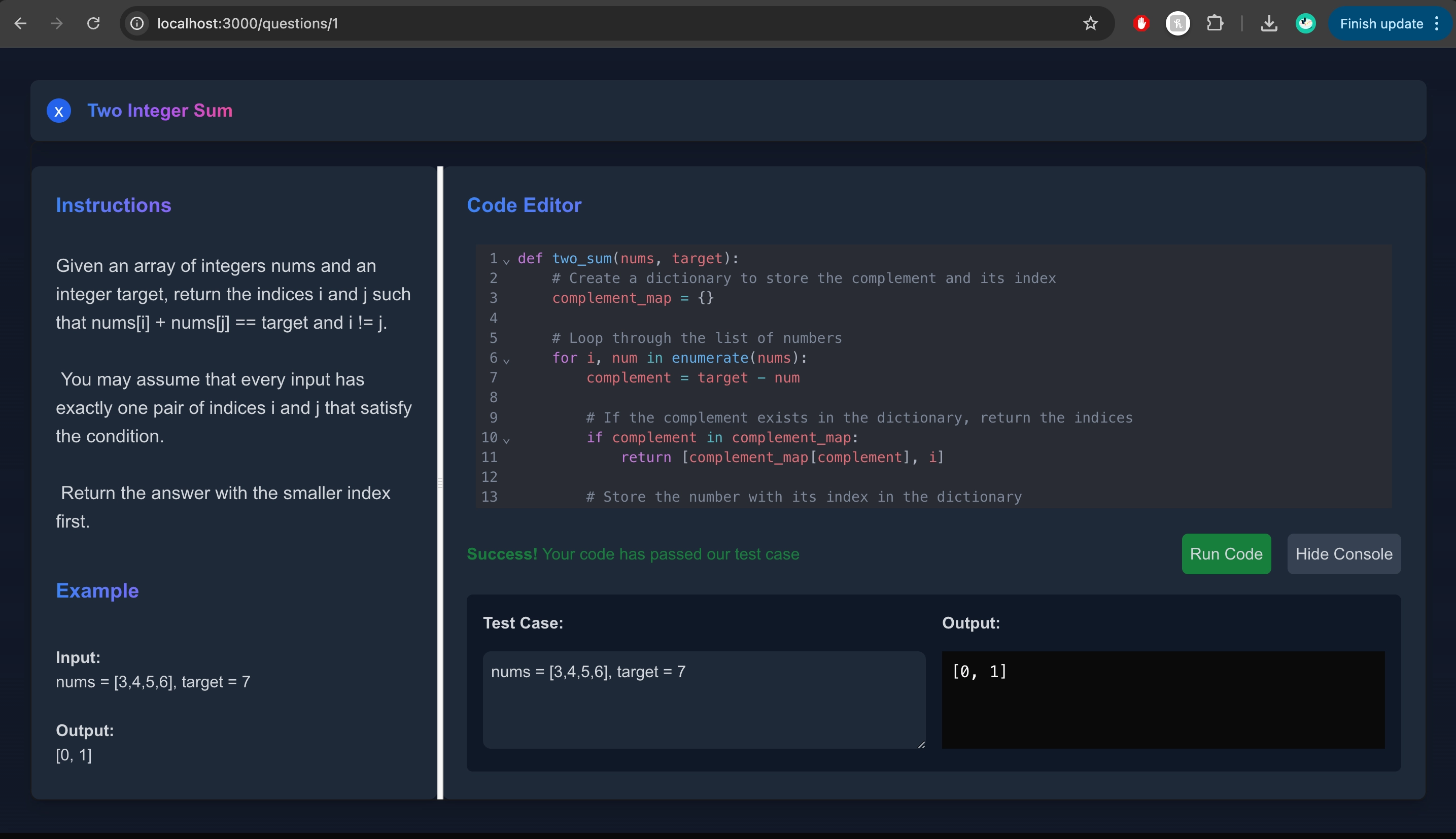 This platform allows users to practice coding problems in Python, featuring a split-view workspace with problem instructions on one side and a code editor with a built-in console on the other. The platform runs code client-side using CheerpX, which emulates a virtual machine in the browser — eliminating the need for server-based execution and improving speed, privacy, and scalability.