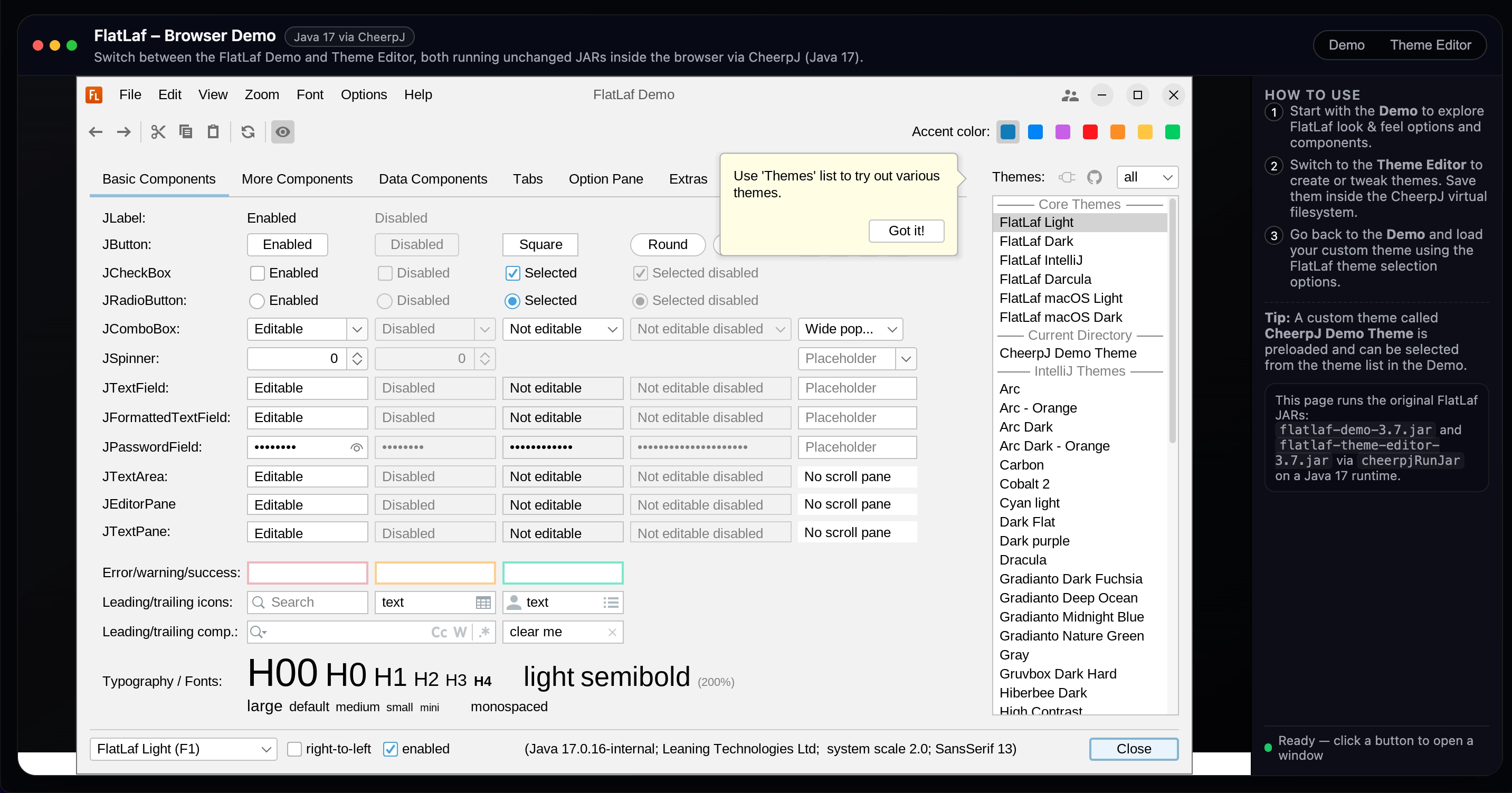 The FlatLaf distribution includes multiple standalone applications. This demo combines two of them into a single browser-based experience: the FlatLaf Demo, which presents a broad overview of Swing components and visual styles, and the FlatLaf Theme Editor, which allows users to create and customize themes interactively.