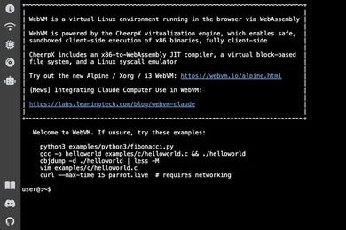 WebVM 2.0 brought major improvements to graphical application support, including the ability to boot a complete Alpine desktop environment entirely in the browser. This demo showcases that capability, running a full Linux desktop client-side without any installation.